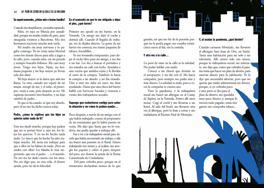 With this book, we want to explain what living on the streets is like, and what could bring a person to live there. We want to show the backgrounds of violence, abandonment, loneliness; the loss of self-esteem, dignity and hope suffered by the people who live on the streets. And we also want to ascertain whether it’s possible to get off the streets, how to do it and why it’s so difficult. Two women and four men who don’t have decent housing tell us what their lives were like before; why and how they lost the house where they lived and what their current lives on the streets are like. These are stories full of pain and injustice, but also full of solidarity and forgiveness. The testimonies that we present invite us to change our perspective, shatter prejudices and rethink how we relate to people who have lost everything.