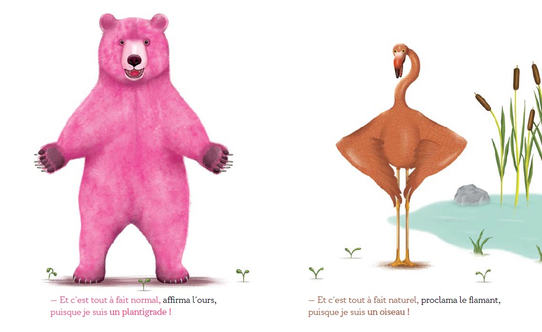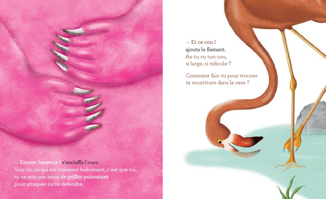 A pink bear and a brown flamingo? What an unusual encounter! Once the laughter and exclamations have died down, the two creatures take a closer look at each other. Strange, curious, confusing, funny, ridiculous… They discover and scrutinize each other. They swing between surprise and laughter. The fear of being mocked and the desire to mock. All their differences are pointed out, well, almost… Because in this story, neither of them is surprised by what is obvious to us, the readers… A pink bear?! A brown flamingo!?
